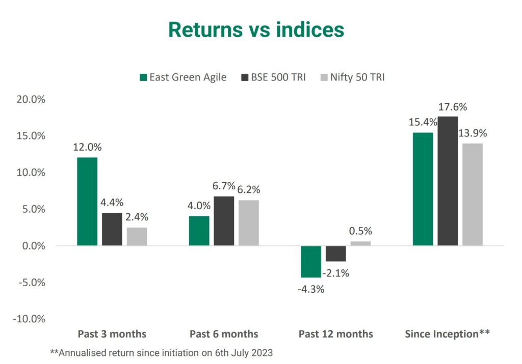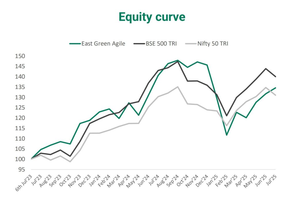 East Green’s Agile strategy was initiated on 6th July 2023. At the end of July 2025, return for the strategy since inception was 15.4% (annualised, post fee and expenses).