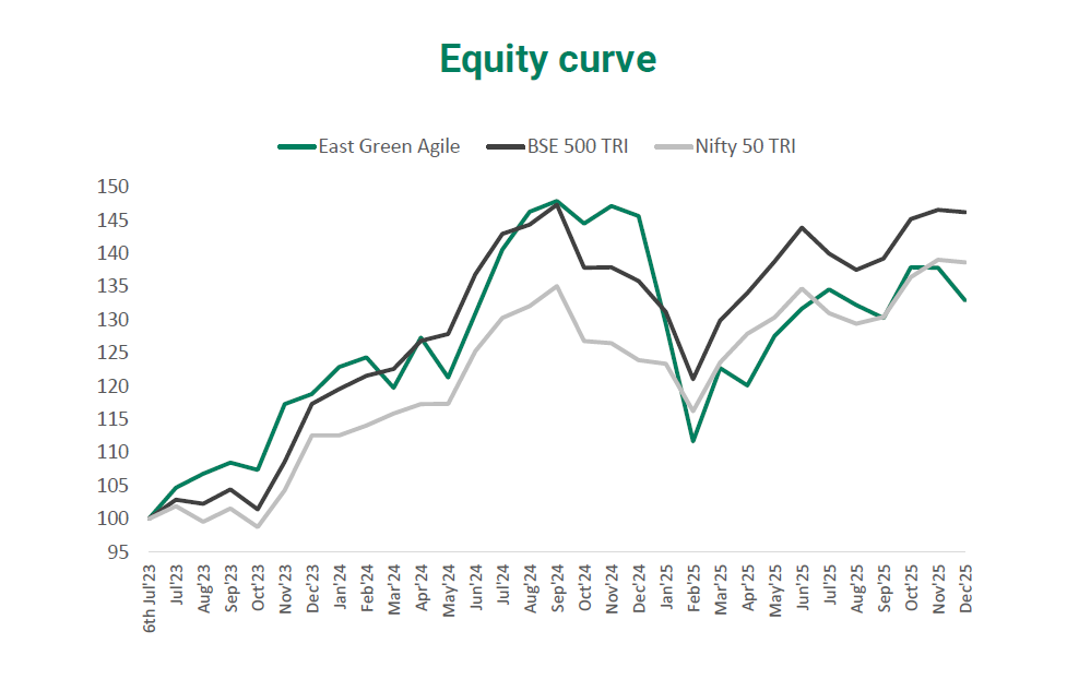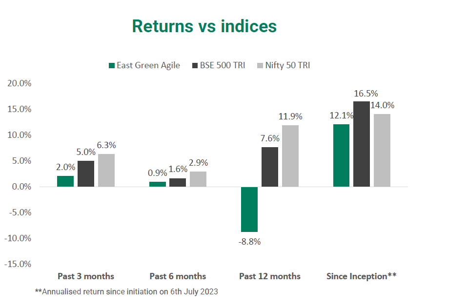 East Green’s Agile strategy was initiated on 6th July 2023. At the end of December 2025, return for the strategy since inception was 12.1% (annualised, post fee and expenses).