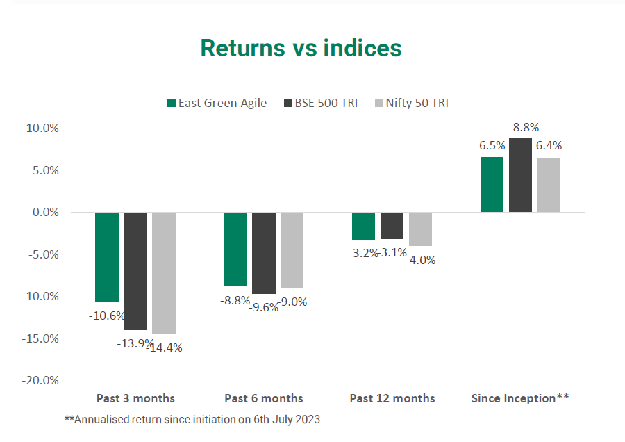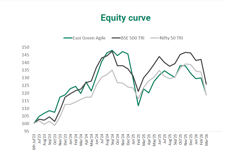 East Green’s Agile strategy was initiated on 6th July 2023. At the end of March 2026, return for the strategy since inception was 6.49% (annualised, post fee and expenses).
